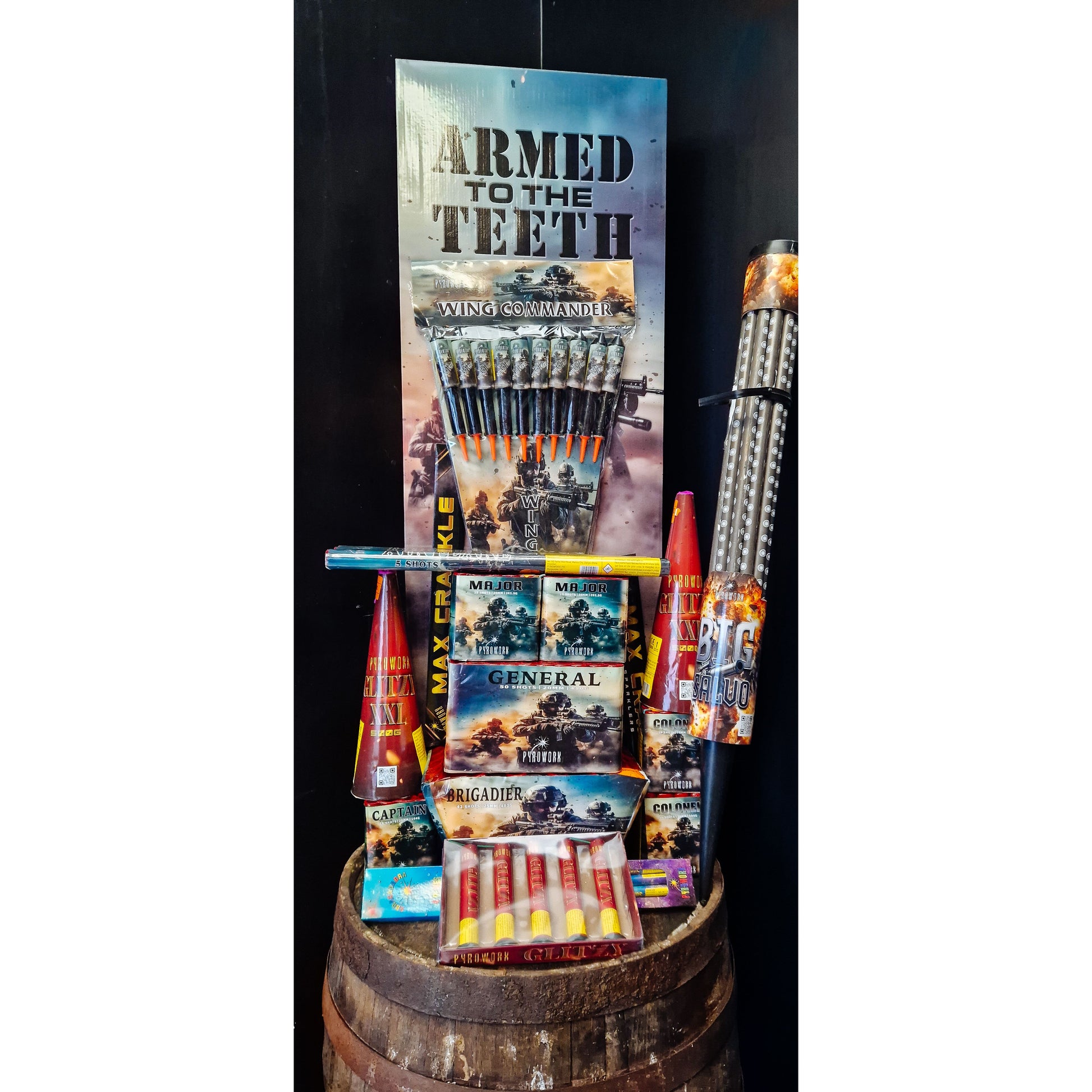 π₯π₯ππ Armed to the Teeth boasts an impressive 43 items, including barrages, fountains, rockets, roman candles, and sparklers. Weighing in at nearly 30kg and packed with over 3 kilos of gunpowder, this military-grade collection is truly outstanding. Prepare for an exhilarating display of excellence with Armed to the Teeth.