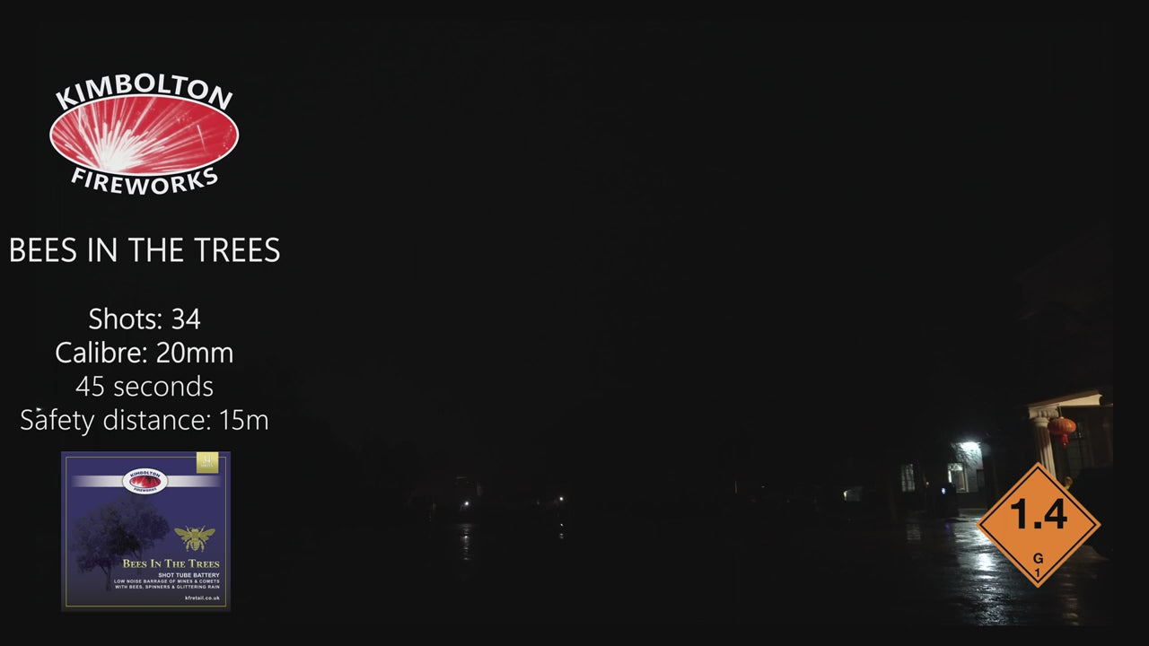 Low noise barrage of mixed mines and comets with bees, spinners and glittering rain. A 34 shot delight.