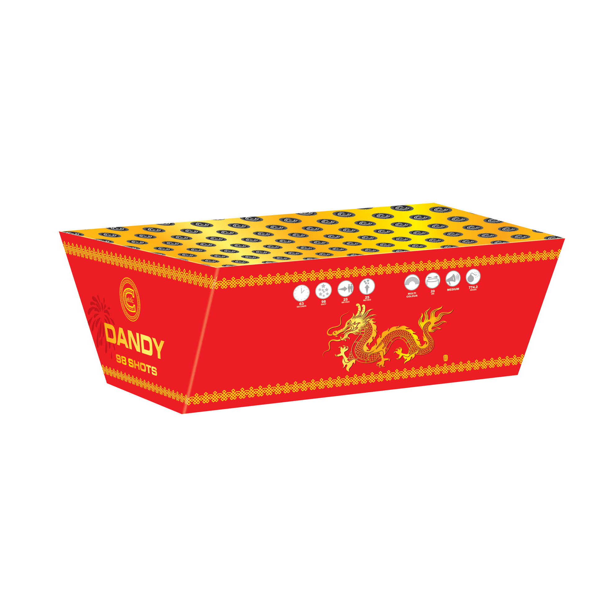 Dandy is a 98-shot, low-noise fan barrage that adds stunning visuals to any display. With a runtime of just over a minute, it features z-firing strobe mines that launch vibrant strobe effects. The show builds up to volleys of colorful strobes and comets, culminating in a crackling finale. Impressive in size yet quiet enough for younger audiences to enjoy!