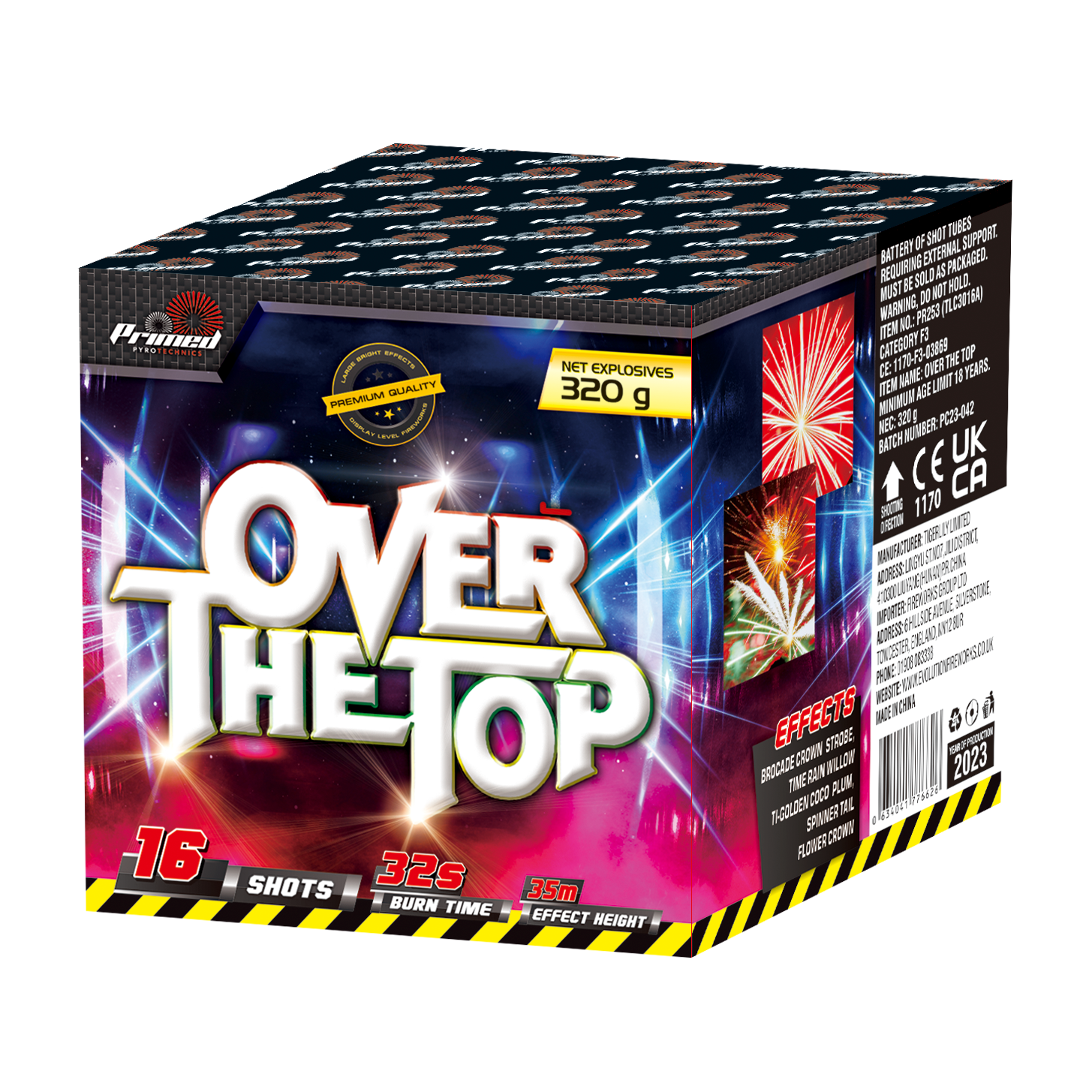 30mm 1.3g bursts are about as big as they come, unless you're launching large rockets. Over the Top delivers a truly impressive display with four shots of brocade crowns with red strobe, followed by four shots of green tails to time rain palms with green strobe. Then, four shots of red tails to Ti-golden coco with yellow plum, and finally, four shots of silver spinning tourbillion tails leading to flower crowns with blue stars. The last three shots are fired simultaneously.