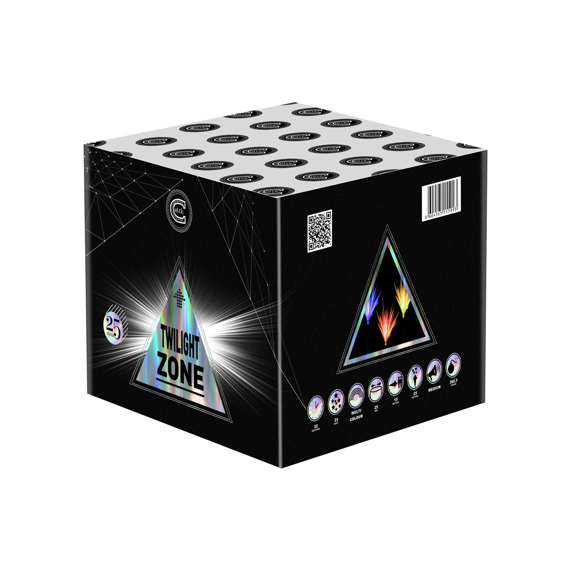 25 shot cake. Crackling mine bursts into red tails to white strobe with purple & green, finishing with green tail into brocade crown. Very powerful for it's size!